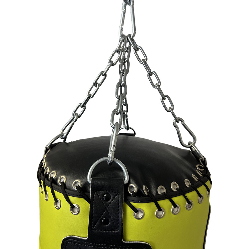 The ATREQ Elite Revolution Heavy Duty Punch Bag + Chain is the perfect addition to any serious boxer or martial artist's training equipment. Constructed from extra thick durable synthetic leather and reinforced with a strong canvas inner lining, this bag is designed for shock absorption and reliable performance in any workout session. The hidden seams create a smooth, even striking surface, while the D-ring tie-down is perfectly secured to the flooring.
