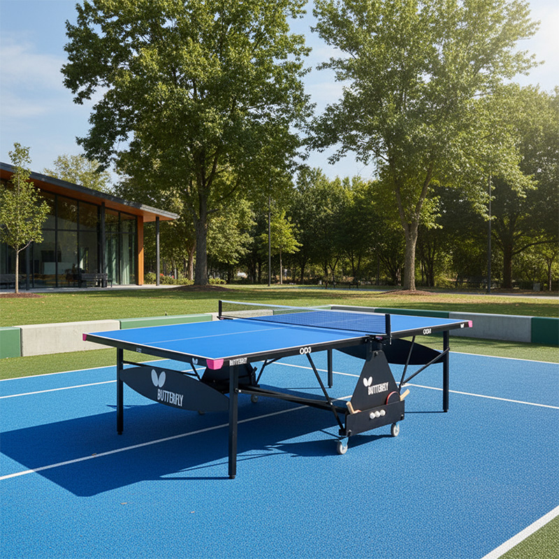 Unleash your competitive spirit with the Butterfly OD3 Outdoor Table Tennis Table, designed for players who seek high-quality performance under any weather condition. With an 18mm plywood resin weatherproof top, this table ensures consistent bounce and durability, making it the centrepiece of any outdoor space, be it a hotel, conference centre, or your own garden. Its robust galvanised undercarriage, coupled with a strong steel frame and corner protectors, guarantees stability and longevity, inviting you to countless matches with family and friends.