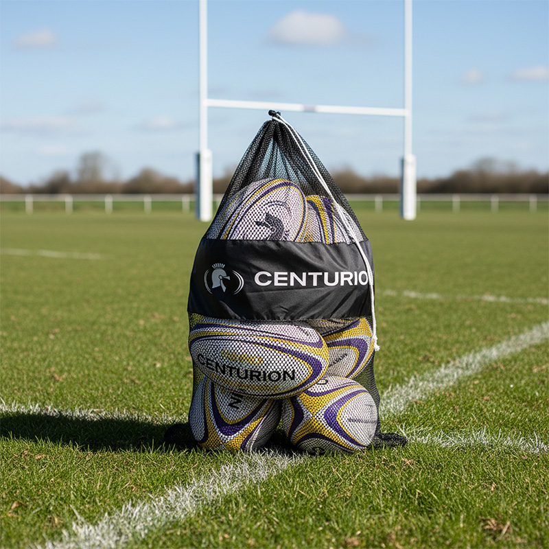 Introducing the Centurion Mesh Holdall, your ultimate companion for rugby training sessions and matches. Imagine heading to the pitch, worry-free, with up to 8 fully inflated size 5 balls securely held in a sleek, durable polyester mesh bag. Its distinct black design, adorned with the iconic white Centurion logo, not only makes a statement but also ensures your balls are easily identifiable amongst the team kit. The breathable mesh material keeps your equipment fresh and ready to play at all times.