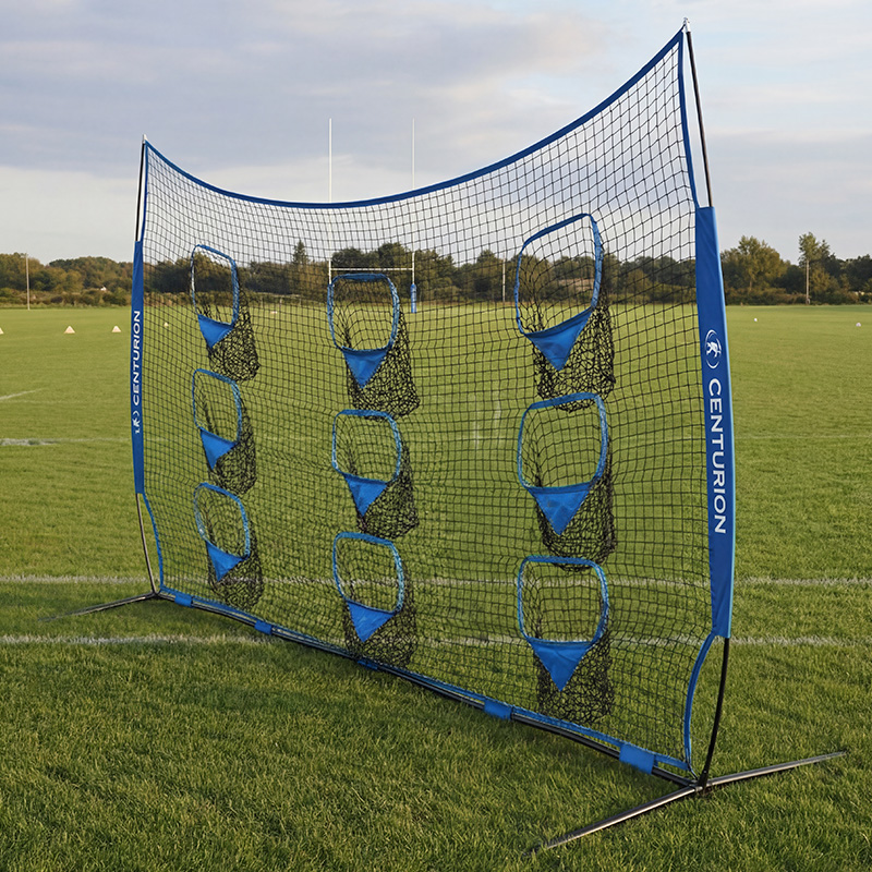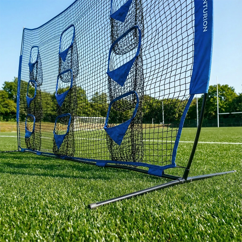 Elevate your rugby game with the Centurion Rugby Passing 9 Target Net, designed for those passionate about perfecting their game. This expansive 12ft x 9ft net provides ample space to practice both indoors and outdoors, offering you the flexibility to hone your skills regardless of the weather. The premium knotless netting endures the repeated impact of rugby balls, while the robust steel poles and reinforced fibreglass uprights ensure stability, standing firm against even the most powerful drives.