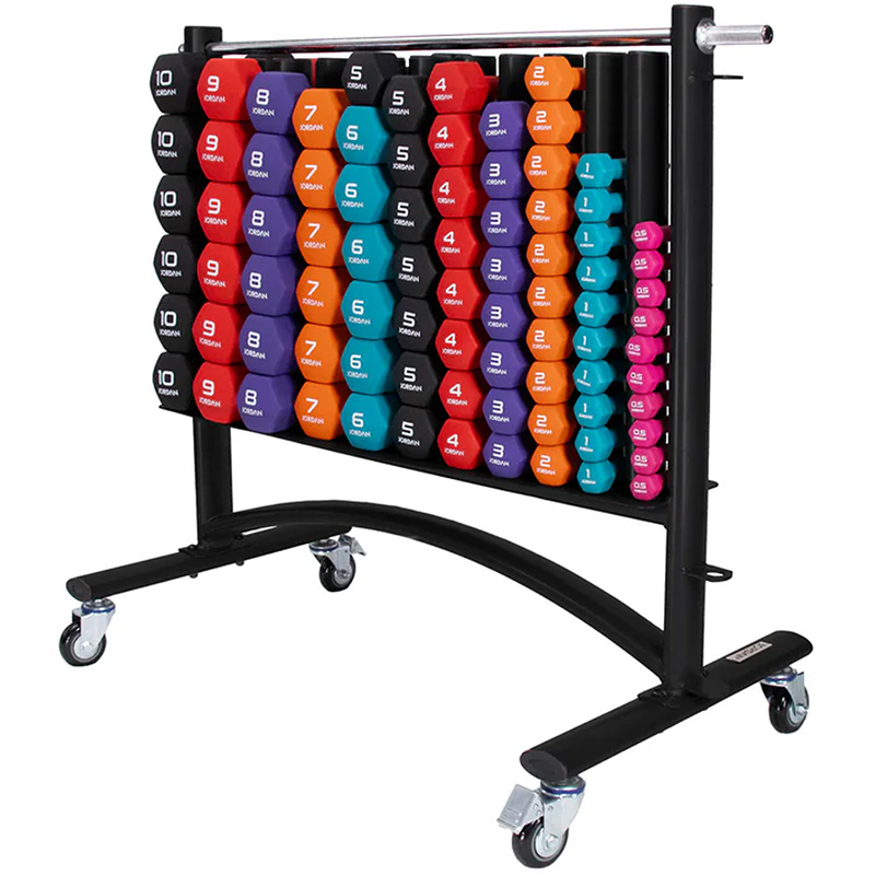 Designed with mobility in mind, the Jordan Studio Dumbbell Rack features lockable wheels, offering the flexibility to move your equipment seamlessly around your space. Whether you're setting up for a workout or clearing the floor for another activity, this rack makes it effortless. Invest now and experience an organised, hassle-free exercise environment like never before. (Please note that dumbbells are sold separately.)