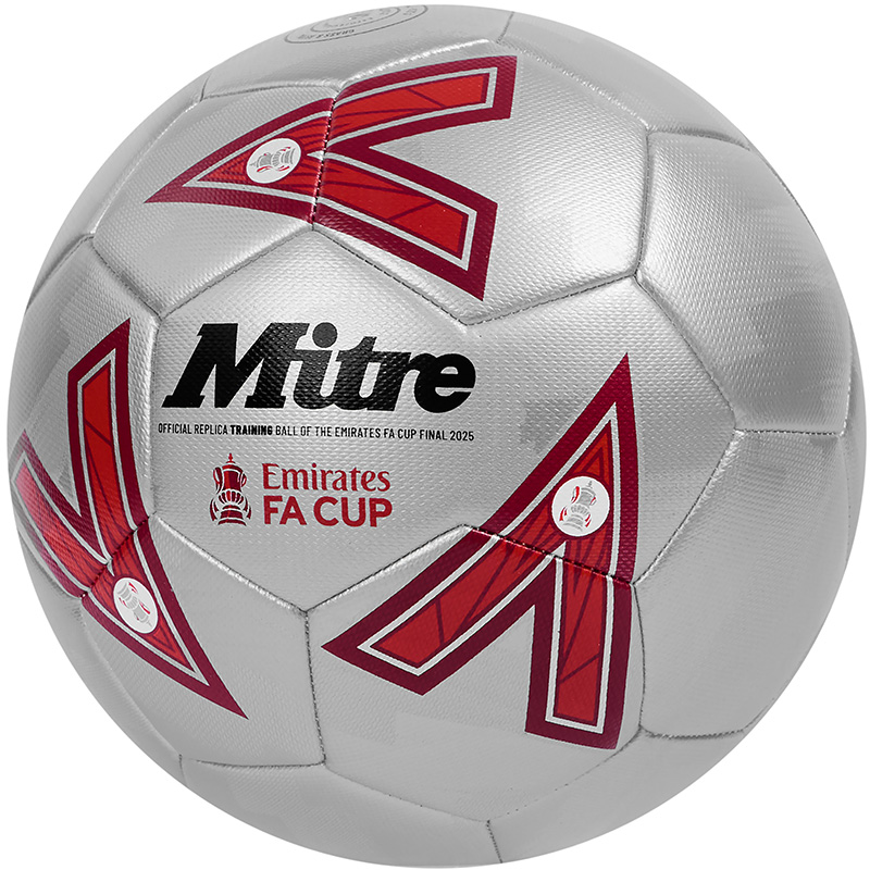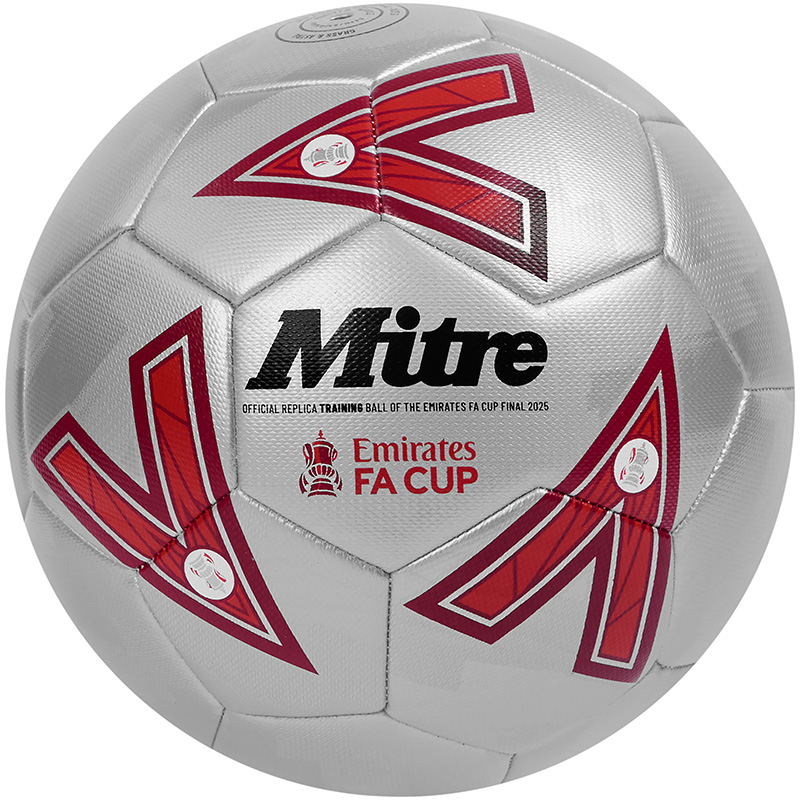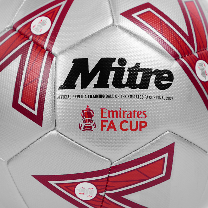 Introducing the Mitre Emirates FA Cup Final Training Football for the 24/25 season. A training level replica of the official Ultimax Pro Emirates FA Cup Ball. Taking inspiration from the match day experience of fans, the tinfoil trophies, buzz and movement in the stands, with a premium silver graphic across the ball.