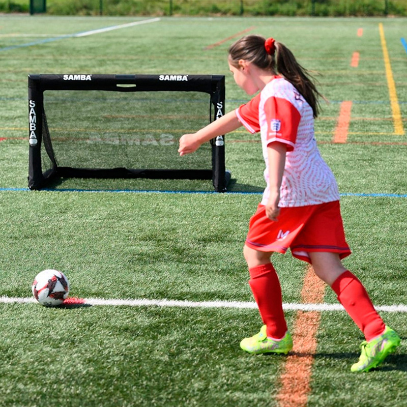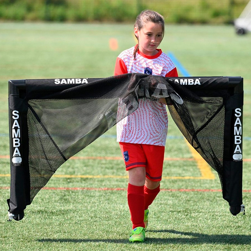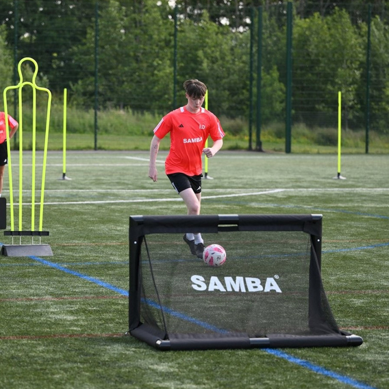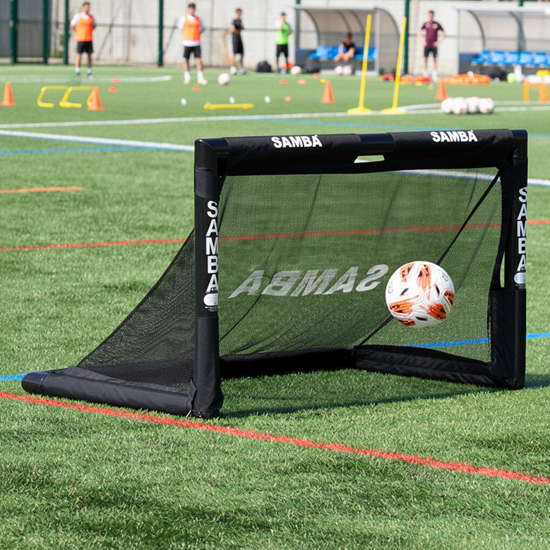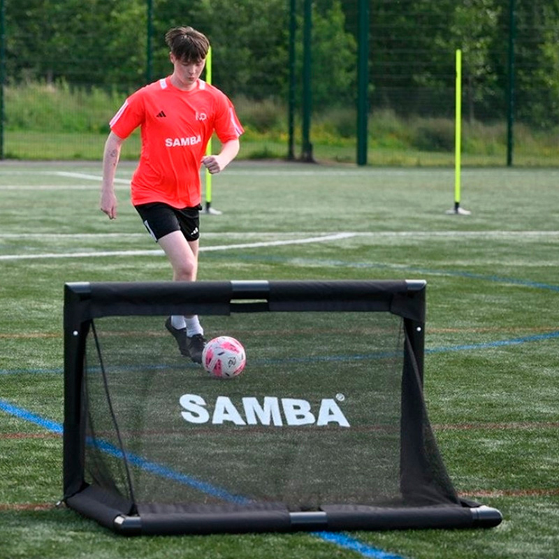 Take your game anywhere with the Samba 3v3 4ft x 2.5ft Football Goal, designed for both matches and training. Whether you're playing 3v3 small-sided games, target shooting in training, or playing in the garden, this top-quality shatterproof uPVC goal delivers durability, portability, and ease of use. Quick & Easy Setup – Unfold and be ready to play in under 10 seconds, no tools required Lightweight & Portable – Weighing just 5kg, it folds flat to 120cm x 75cm x 14cm, making it easy to transport and store. Will fit in a boot of a car.