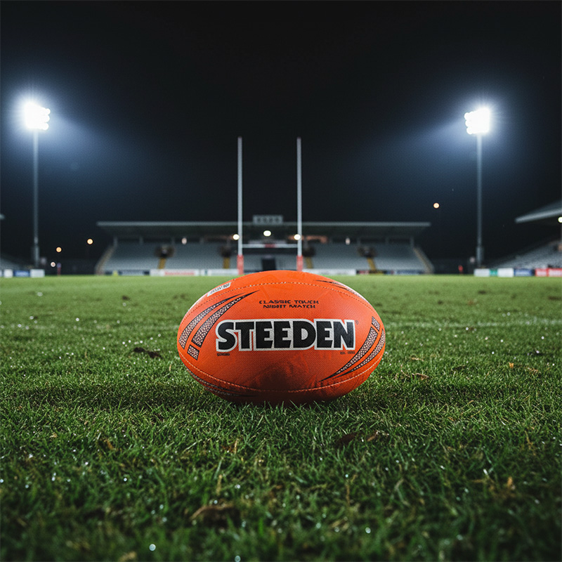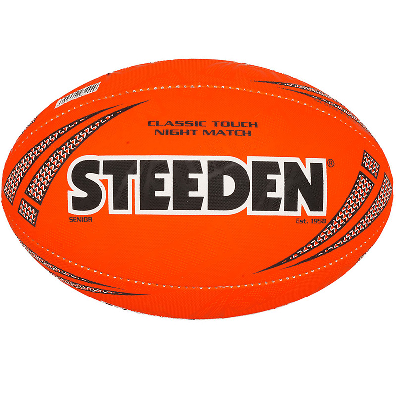 Elevate your touch rugby game with the Steeden Night Touch Rugby Ball, the official NRL Classic Touch Football Night Match Ball. Designed to shine on the grandest of stages, its bright orange hue ensures optimal visibility in low-light conditions, perfect for those evening matches. Featuring a raised grip system specifically tailored for touch football, this ball provides unparalleled grip, enhancing player ability and team skill execution.