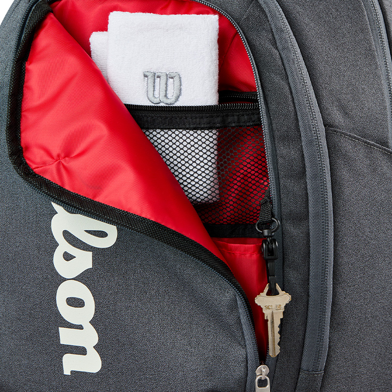 Inside, you'll find a padded laptop sleeve to protect your tech and a ventilated pocket to keep dirty clothes or shoes separate from the rest of your gear. With multiple accessory pockets for organising essentials and adjustable backpack straps for comfortable carrying, this 100% polyester bag is a winner both on and off the court. Versatile, functional, and stylishly practical—that’s the Wilson Tour Backpack.